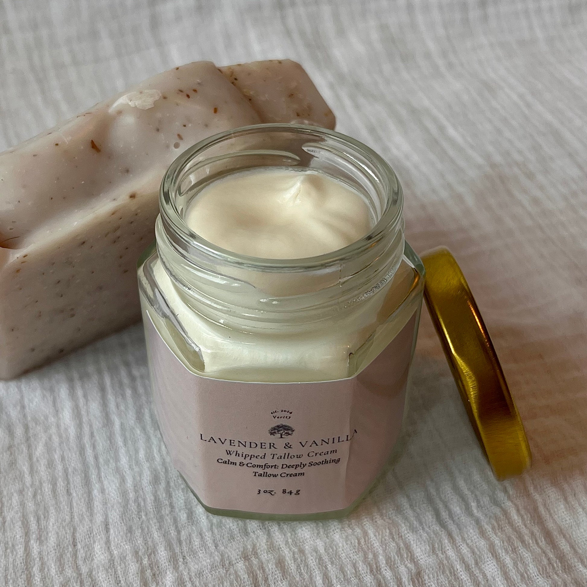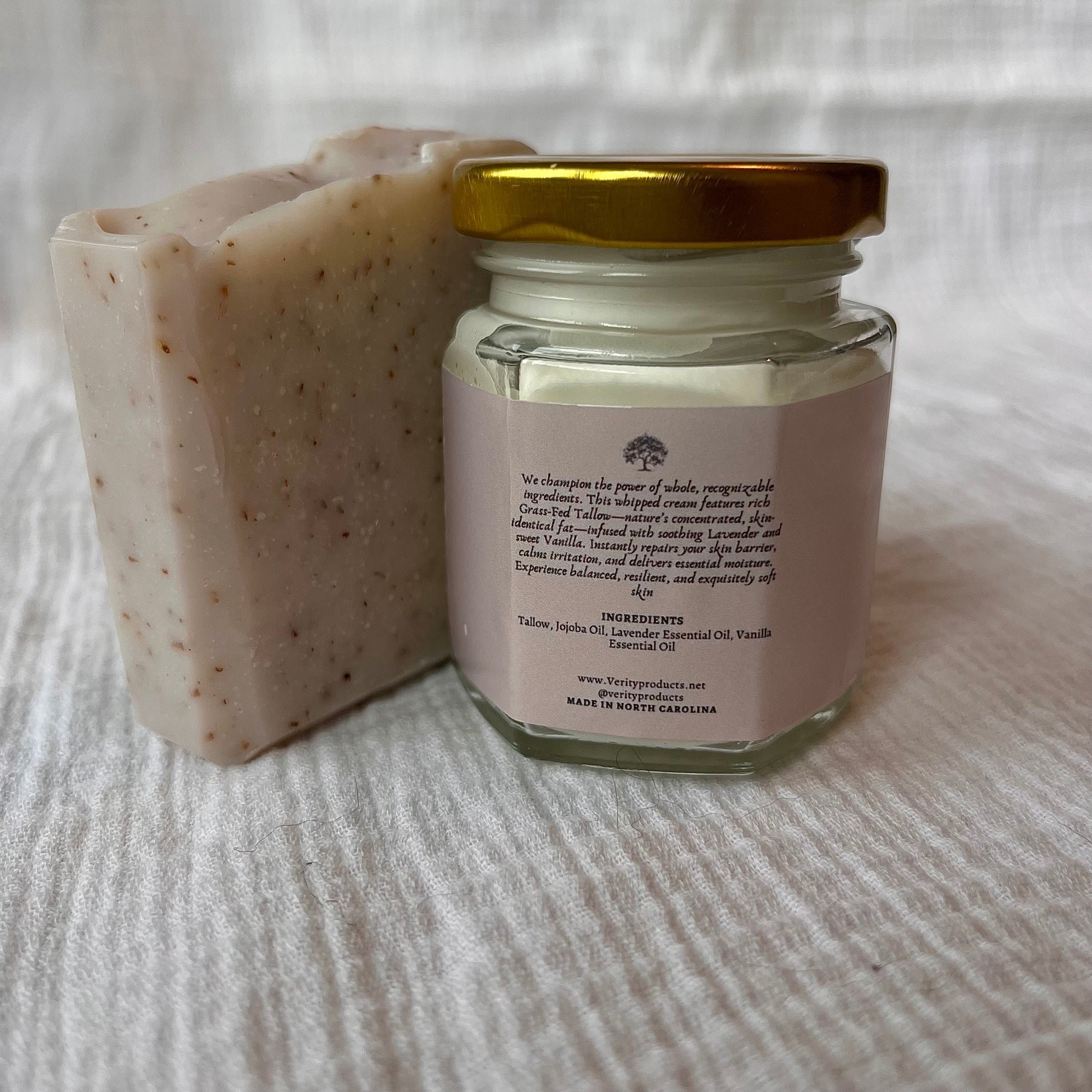 Our Lavender Soap provides a gentle, effective cleanse, while Lavender Vanilla Tallow Cream delivers deep, comforting moisture. Both are crafted with clean, non-toxic ingredients and a soft lavender aroma that makes daily body care feel calm and restorative.